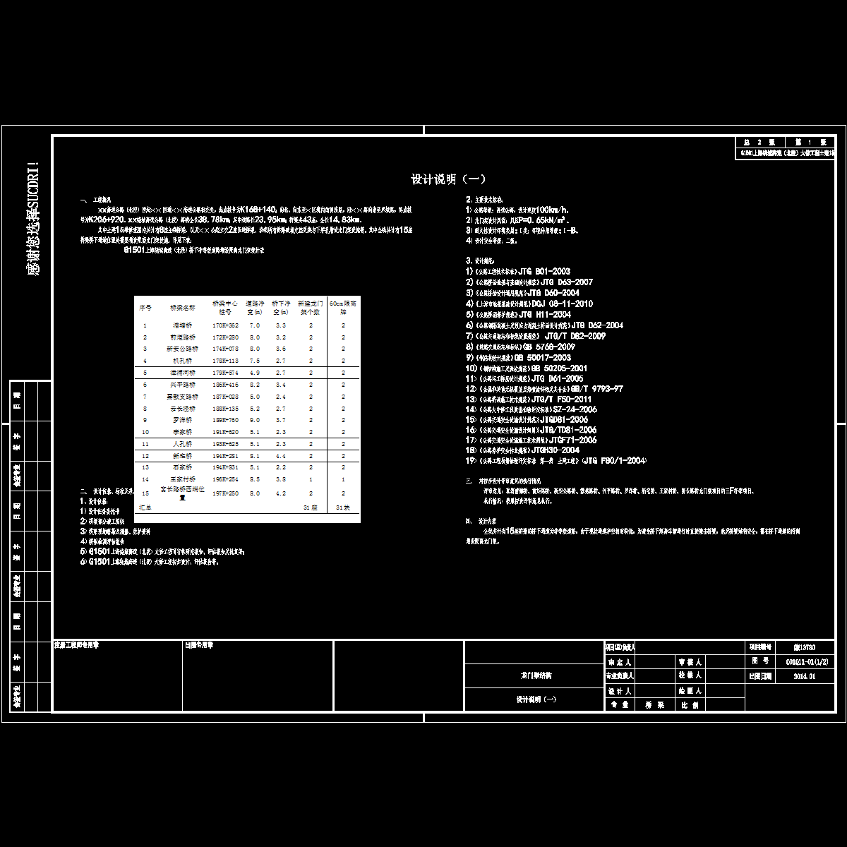 设计依据:《公路桥涵施工技术规范》JTG/T F50-2011;《上海市地基基础设计规范》DGJ 08-11-2010。 绕城高速公路全长38.78km;其中道路长23.95km;桥梁共43座,全长14.83km。桥下通道位置处需要增设限高龙门架设施。普通钢筋:采用HPB300钢筋和HRB400钢筋。钢管均采用热轧无缝钢管。采用425及以上的硅酸盐水泥和普通硅酸盐水泥,并应采用低碱含量的水泥以克服碱骨料反应。 主要内容: 1)龙门架结构的立柱及弦杆采用矩形断面焊接钢板。 2)基础均采用混凝土扩大基础。 3)龙门架上悬挂限高标志牌,并于弦杆下悬挂钢管吊杆,吊杆至路面高度为道路通行限高高度,悬挂吊杆应采用铁链。 4)吊杆规格为?70x4无缝钢管,外刷红白漆。