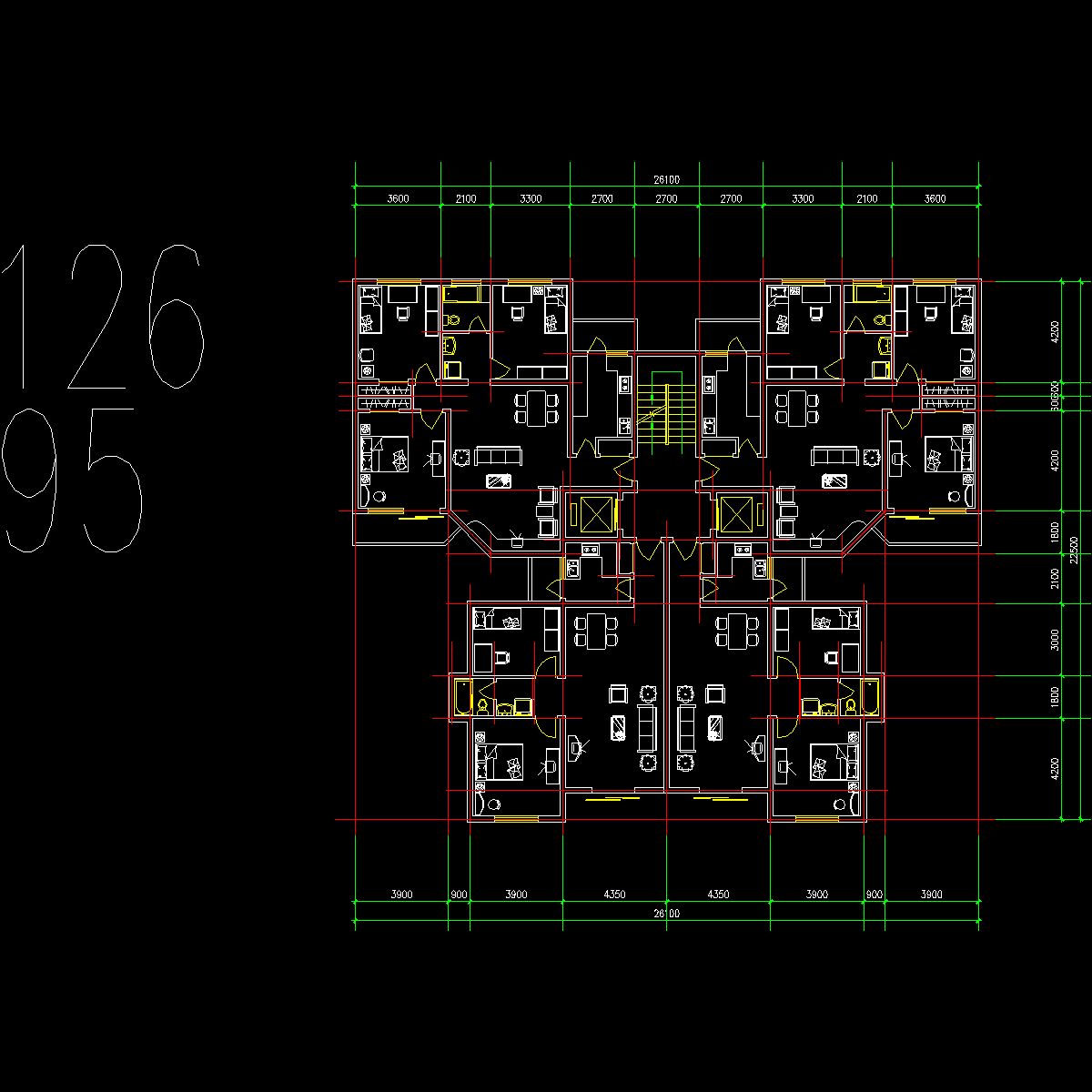 塔式高层一梯四户型图(126/95) 户型:三室两厅一卫、两室两厅一卫 标准层建筑面积:442 一梯户数:4户 板式、塔式:塔式 户型大小:中等户型
