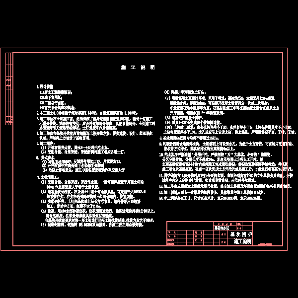 基坑开挖深度约5.6米,采用土钉墙基坑支护结构,井点降水。井点管冲孔直径不小于300,反滤层使用加工砂,用黄泥封口。包含设计说明、 平面布置图 、剖面图及节点详图,6张。