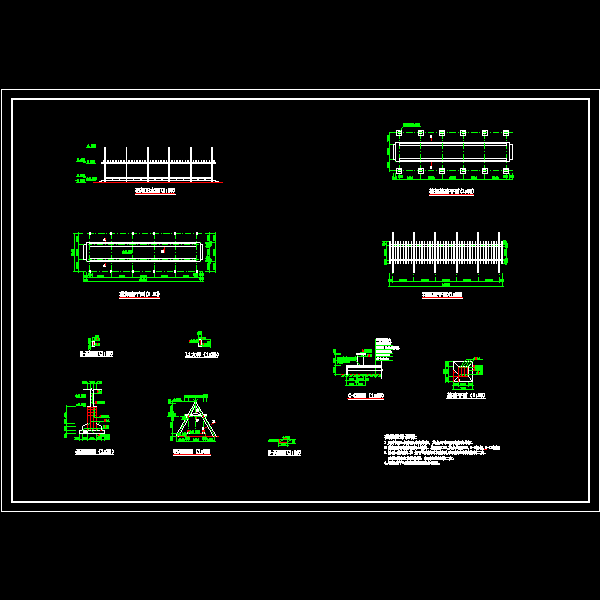 木质花架施工图,包括花架设计说明、基础平面图、底平面图、正立面图、基础断面、花架断面、剖面图、基础平面,共一个CAD 文件。